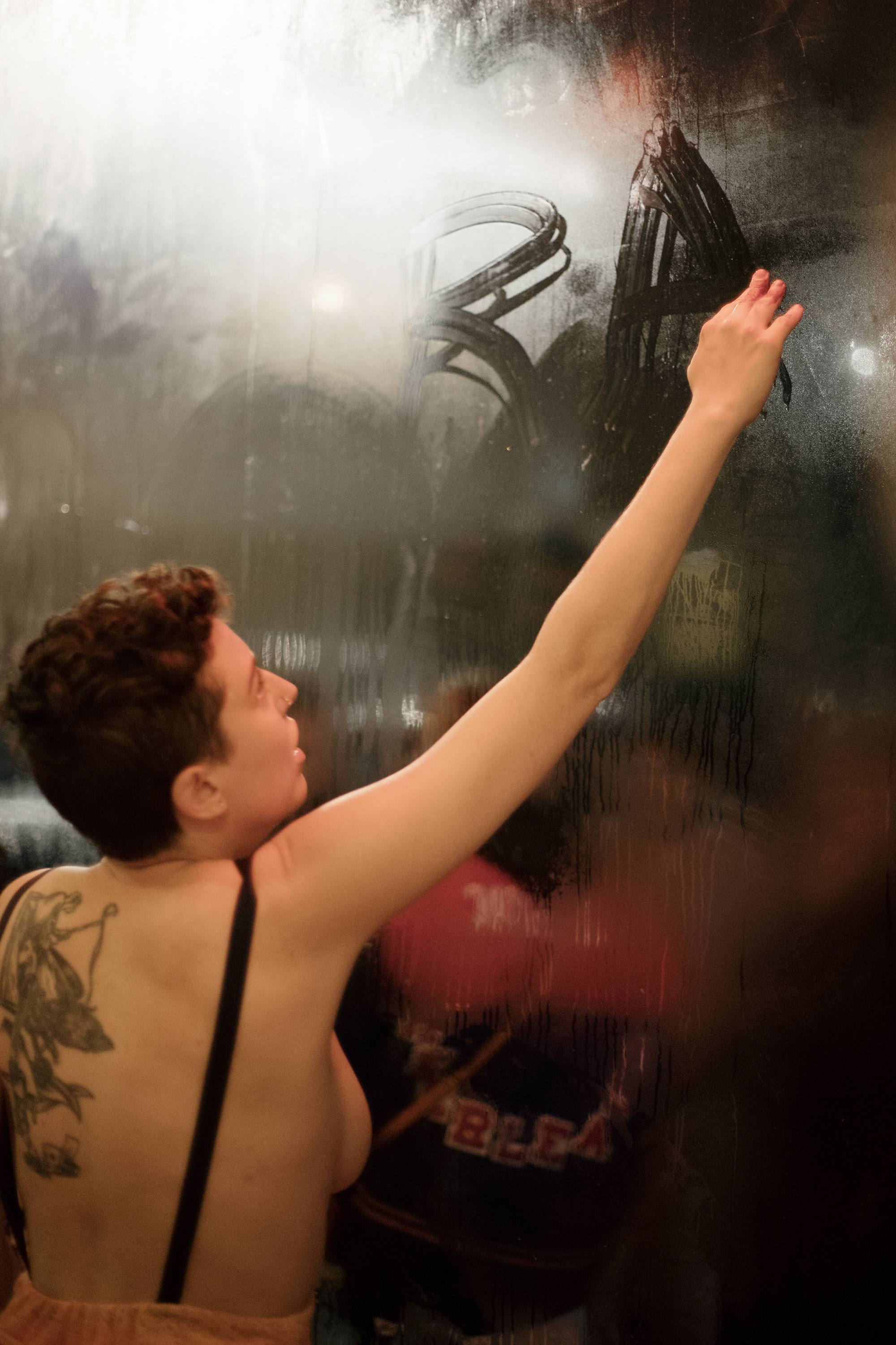 red bowling ball without holes, small mirror, four hand-sewn “augury flags” under which witnesses sort themselves, RAW LIVES/CIVIL WARS written with bloody fingers on the window, discussions with persons present about 1.) offensive aspects of the body/deoderent 2.) anxieties about disease and illness/skin cancer scars 3.) class/eating seaweed from the beach 4.) lies/evil-doings/headlamp and whispers. Songs sung and bowiing ball buried in the small garden on the roof of the space