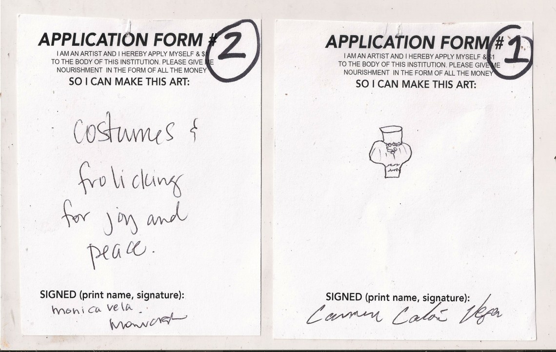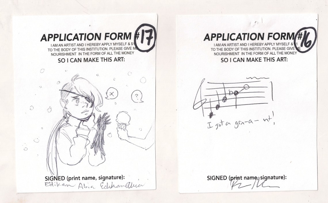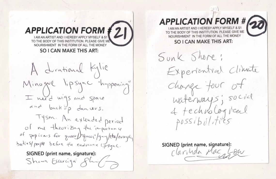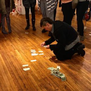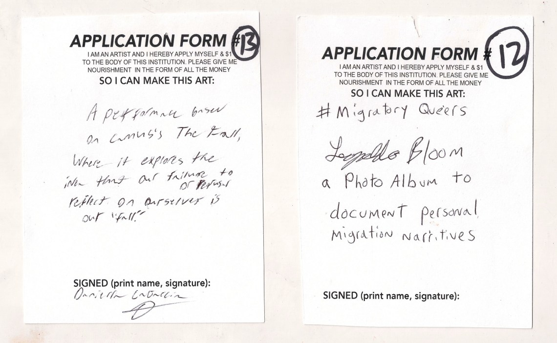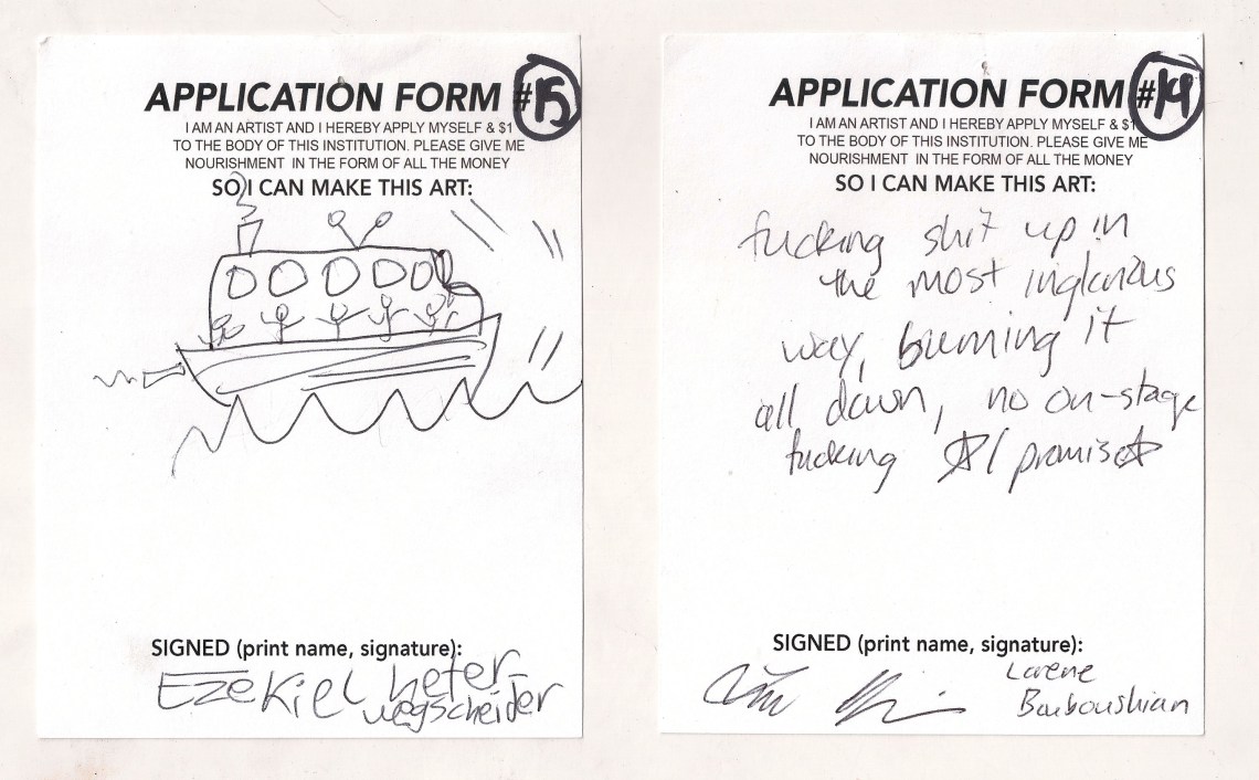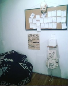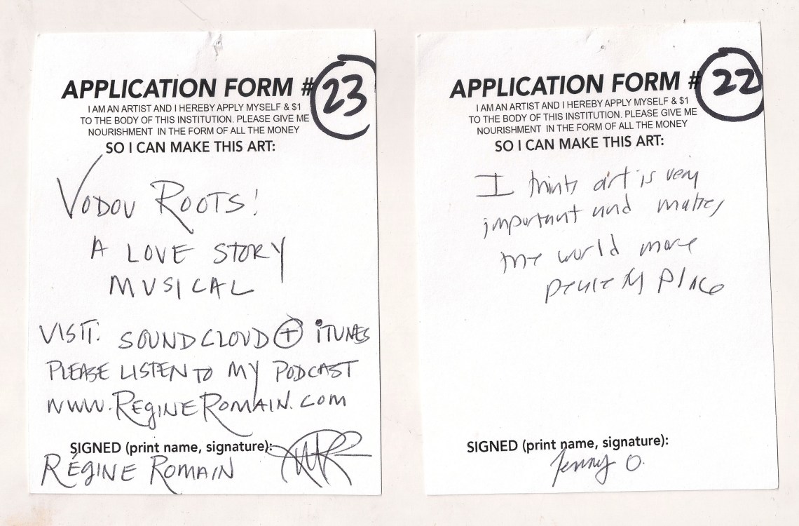4-day durational/interactive process along 14th Street, embodying institution of a grant. 26 Applications and fees collected, applications installed at the Westbeth Gallery (55 Bethune) and voted on via ballot by visitors through October 27. Elected grantee will receive the pooled application fees + any donations. Grant recipient TBA at the Art in Odd Places exhibition closing party, October 27, 2018.