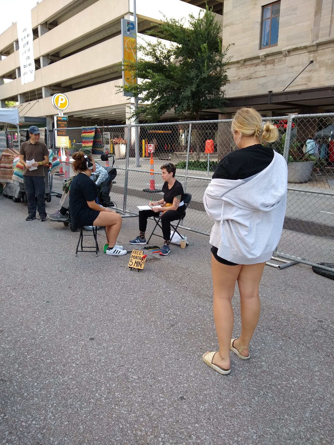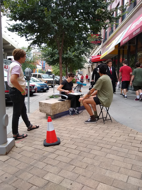 Over 8 hours (4 hours each day) I drew around 35 portraits, spoke with many people, and enjoyed kettle corn that one participant brought me (many folks were uncomfortable not paying or tipping me for the portrait). Portraits became the property of the sitters/participants/subjects after the drawing exchange and not documented.