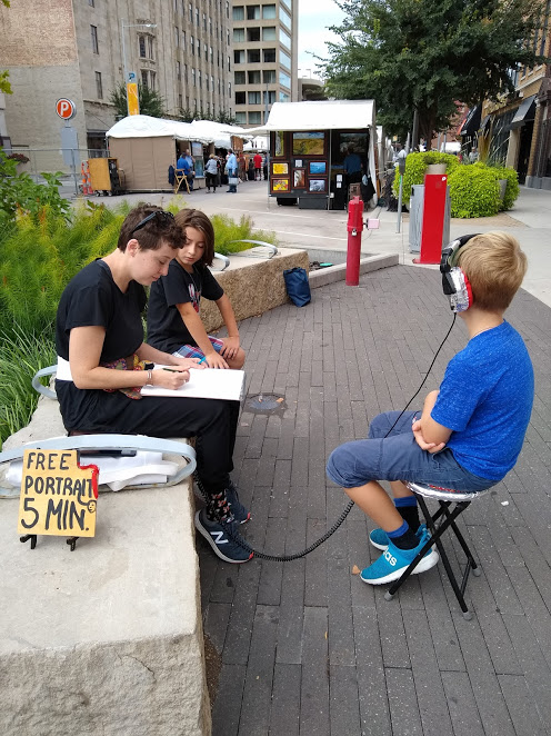 Lincoln, Nebraska: portrait-drawing as part of ARC research into affective transfer and affectionate transaction. In the context of a two-day local art fair, I felt my presence there drawing portraits as a bridge between “high” and “low” art, experiencing my role as part “legitimate artist” (framed by Lincoln PoPS “Global Frequencies” Play on P Street public art program) and part “vendor” or “art activity” (framed by common “caricature” services often offered at fairs, zoos, and other social/community events, related to face-painting and other “art” activities available). Because my performance was free, pressure was placed on how capitalism locates creative practices. Because my performance involved sitters/subjects listening to a sonic piece while I drew their portraits, their initial conceptions of sitting for a portrait (or caricature) were altered during our interaction.