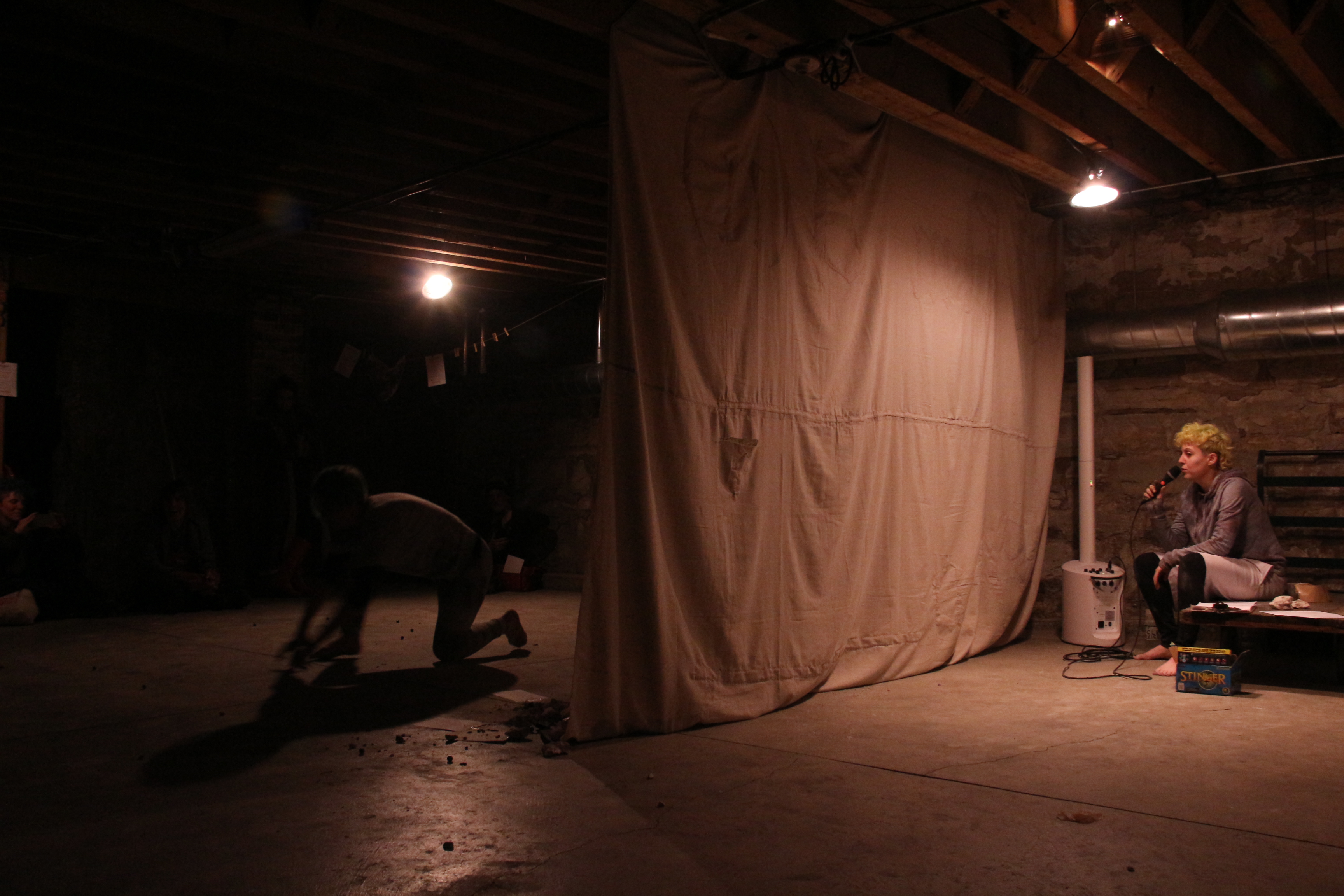 9 “conceptual event surveys” (Loss, Revelation, Conflict, Transition, Accident, Sickness, Transgression, Breakage, Achievement) filled out by those present and put through a slot in a curtain: Kaia and Esther substantiate each survey through a 3-part score (1) someone in this room _______ [conceptual event qualities/affects] (2) performer’s body is a _________ [relic] who/that _______[properties/affects] (3) performers take turns realizing ___________[conceptual event/relic properties]